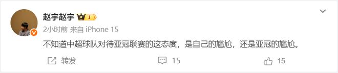 值得一提的是,在稍早结束的一场比赛中,成都蓉城在主场0-2不敌马来西亚球队柔佛新山,而在上海海港也同样输球后,记者赵宇也是发文表示,不知道中超球队对待亚冠联赛的这态度,是自己的尴尬,还是亚冠的尴尬。
