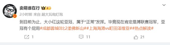 而媒体人“卖萌谁在行”则是在个人社媒这样写道:“到目前为止,大小红这轮亚冠,属于“正常”发挥。毕竟现在肯定是搏联赛冠军,亚冠有个P用!”